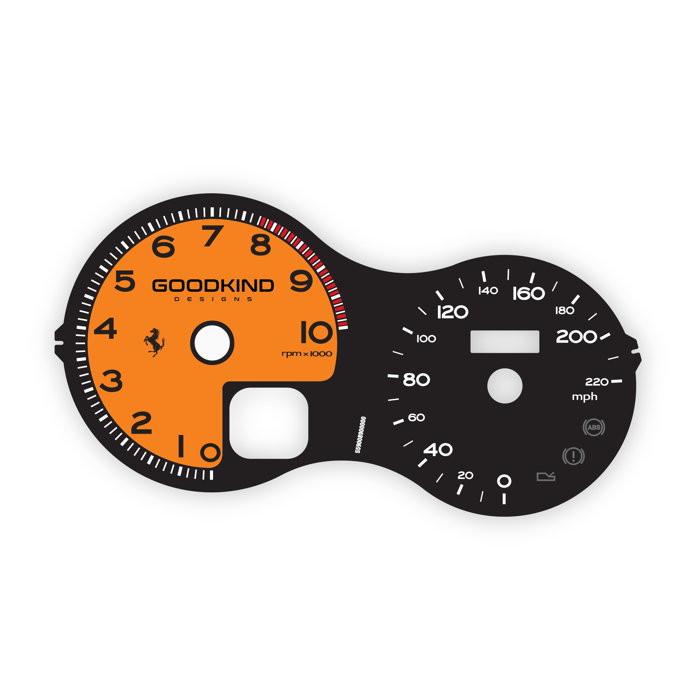 Ferrari 575 custom gauge face without gearbox window – Custom logo – MPH – Black with Orange tachometer.