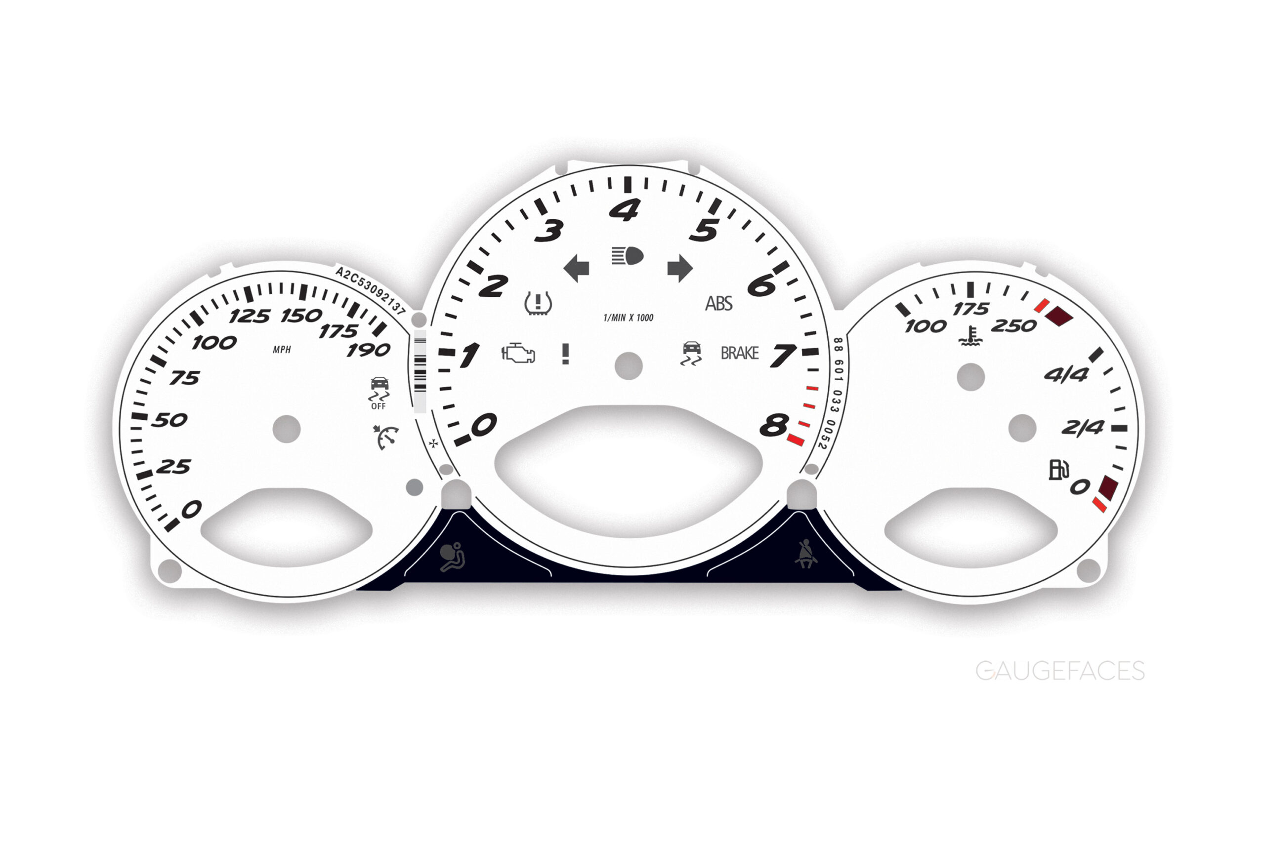 Porsche 987.2 Boxster S, 3.4L – Tiptronic/Manual – 190 mph / 300 km/h – 8000 RPM – instrument cluster gauge face – White.
